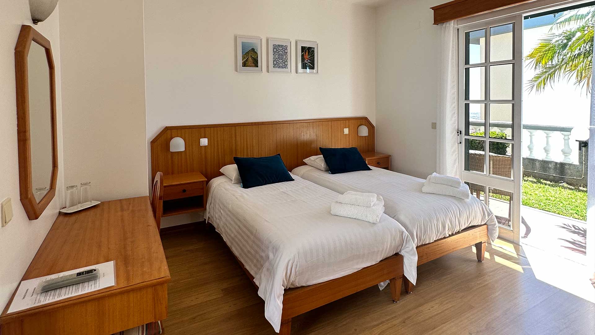 A standard twin room with terrace, features two comfortable twin-sized beds, a private bathroom and a terrace area where guests can relax and enjoy the stunning views of the Funchal.